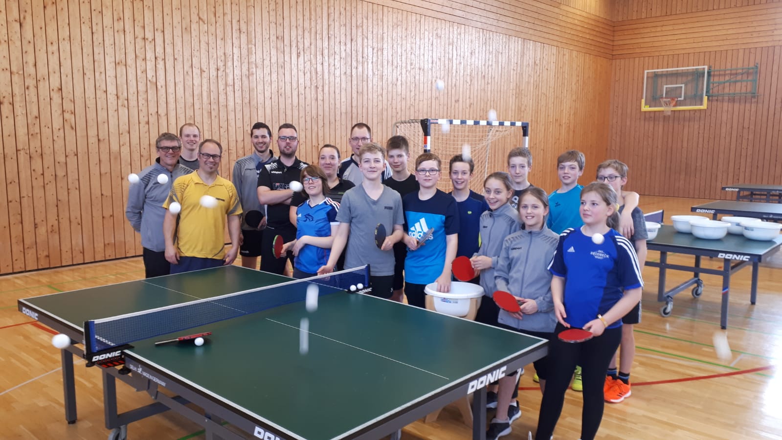 In der Hofbühlhalle 4 Tischtenniplatten (also 8 Spieler/innen) + 1 Trainer