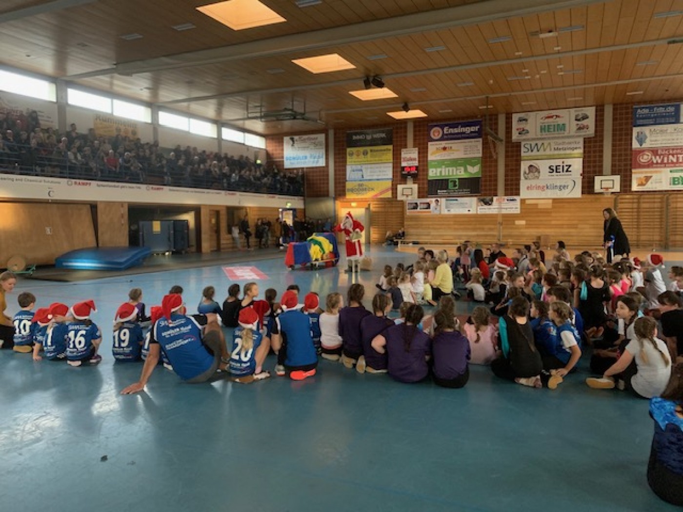 Danach sorgten die Minis und die F-Jugend des Handballnachwuchses für ausgelassene Stimmung in der Hofbühlhalle. Während die Kleinsten, die unter Verena Knecht und Thomas Reusch trainieren, passend zur musikalischen Untermalung mit Nikolausmütze und zielsicher aus Bällen und Hütchen geformte Weihnachtsmänner abschossen, waren die F-Jugendlichen mit ihrem Trainer Tilmann Müller akrobatisch unterwegs und zeigten gewagte Sprünge und Trickwürfe vom Trampolin aus.