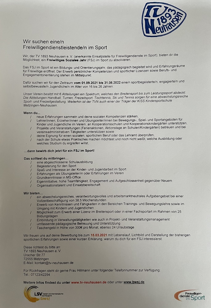 Die Vereinsgeschäftsstelle des TV 1893 Neuhausen e.V. bleibt weiterhin geschlossen, gerne können Sie Anfragen per Mail an Diese E-Mail-Adresse ist vor Spambots geschützt! Zur Anzeige muss JavaScript eingeschaltet sein! stellen. Diese werden zeitnah beantwortet.